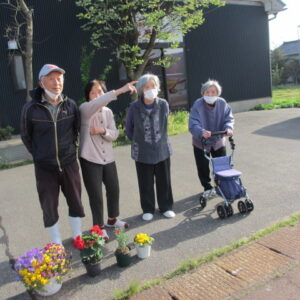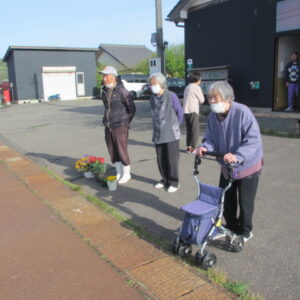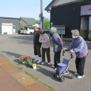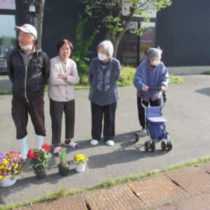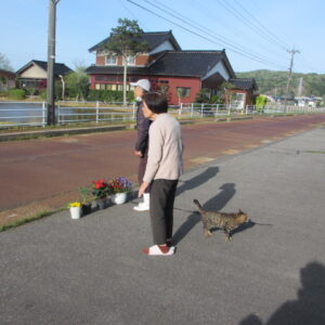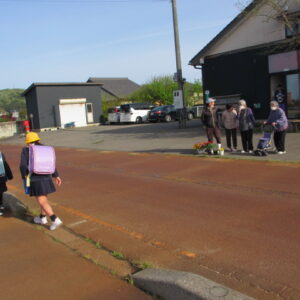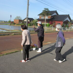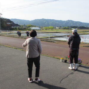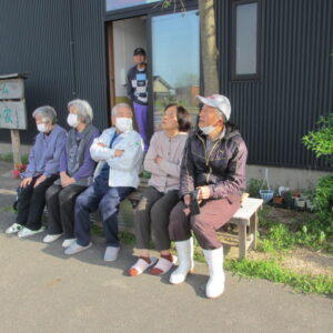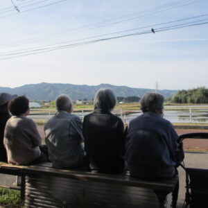 毎朝の挨拶運動のあとは、のんび~り座って、田園風景を眺めながらおしゃべりを楽しんでいますよ!